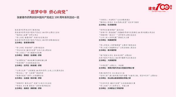 举行“追梦中华 侨心向党”张家港市侨界庆祝中国共产党成立100周年系列活动,既是纪念我党走过的百年光辉历程,也是在侨界开展党史学习教育的重要举措。活动期间,包括各区镇、高校在内的全市侨联系统,将通过征文比赛、主题书画展、线上文化服务、红色经典诵读大赛等主题活动,进一步弘扬侨界与党同心的赤子情怀,铸牢侨界群众听党话跟党走的坚定信念。