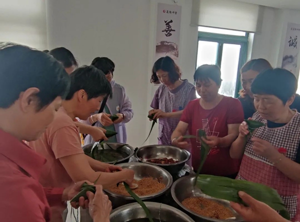 粽子飘香,古风流长。为了迎接即将到来的端午节,侨眷们一起动手包粽子,先将墨绿色的粽叶洗净,将粽叶折叠成一个个沙漏状,再将糯米、粽子馅倒入其中,包好,用细绳捆扎起来,一个粽子就成型了!