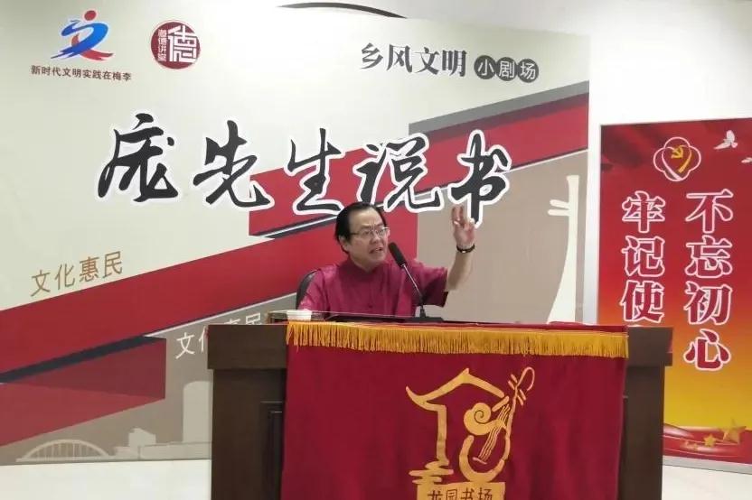 庞志杰老师作为侨界的评弹艺术家,自党史学习教育开展以来,他在梅李聚沙园“龙园书场”开设“庞先生说书”红色专场,并在各村(社区)实践站开展巡回演出,将党的百年辉煌和梅李红色故事以评弹的形式送向最基层。