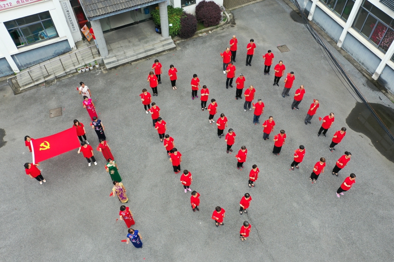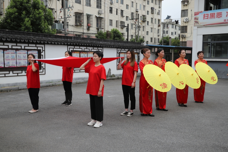 9:30开场,观景社区“红豆侨屋”旗袍队以一曲“最美的歌儿献给党”拉开了庆祝中国共产党成立100周年的序幕。4名青年党员手举党旗走向广场一侧。旗袍队4名队员手拿“侨”“心”“向”“党”四面油纸伞婷婷而出。随着音乐响起,旗袍队员以最饱满的侨姿侨韵,深情表达对党的热爱。曲未毕,50名手持小党旗的社区党员、侨眷以最昂扬的步伐,快闪走到广场中央,搭成“100”字形,用最嘹亮的声音表白:“侨心向党,庆祝中国共产党成立100周年。”