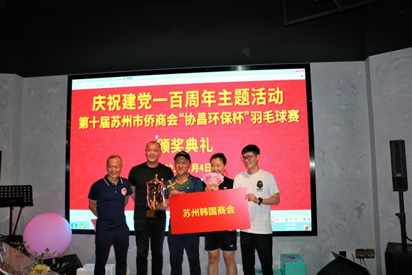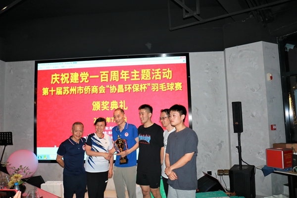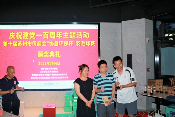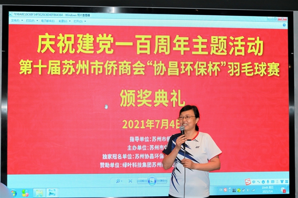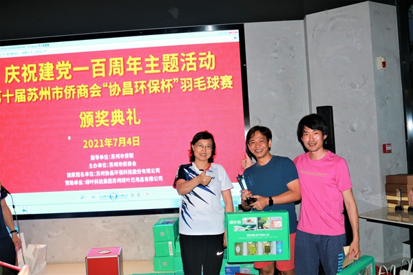 苏州市侨联主席沈晋华出席颁奖仪式并致辞。她说,苏州市侨商会用十届“侨商杯”祝贺中国共产党成立100周年,这十届“侨商杯”羽毛球比赛,始终坚持“友谊第一,比赛第二”,与全市各个商会和球队友好交流。希望在未来的时间里,苏州市侨商会能团结更多的商会、协会、球队加入到这个活动里来,在体育交流的同时,增强各个会员企业之间的互动,为企业的发展创造更多的机遇,增进在苏企业家之间的姑苏情谊。