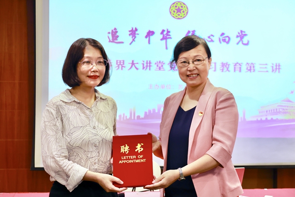 此次侨界大讲堂特邀苏州市委党校、市行政学院党史党建教研室教授、主任刘建芳担任主讲。为切实抓好侨界思想政治引领,进一步提升侨联系统党史学习教育成效,市侨联聘请刘建芳教授为“苏州市侨联党史学习教育特聘辅导员”。沈晋华主席为刘建芳教授现场颁发了聘书。