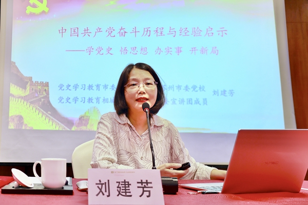 课上,刘建芳教授以《中国共产党奋斗历程与经验启示——学党史 悟思想 办实事 开新局》为题,系统阐述了党史学习教育的重大意义,带领大家全面回顾了中国共产党的奋斗历程及伟大成就,教育大家要从党史中汲取经验启示,坚定“四个自信”,崇德力行开新局。
